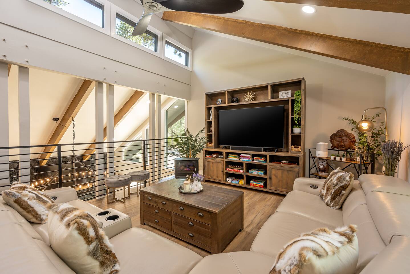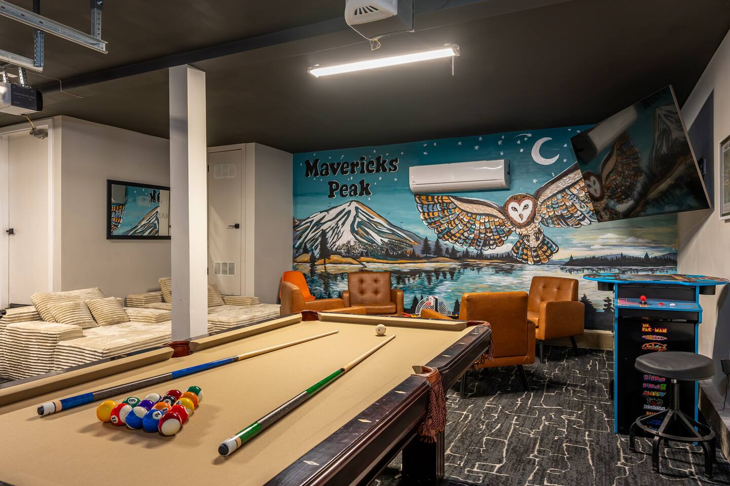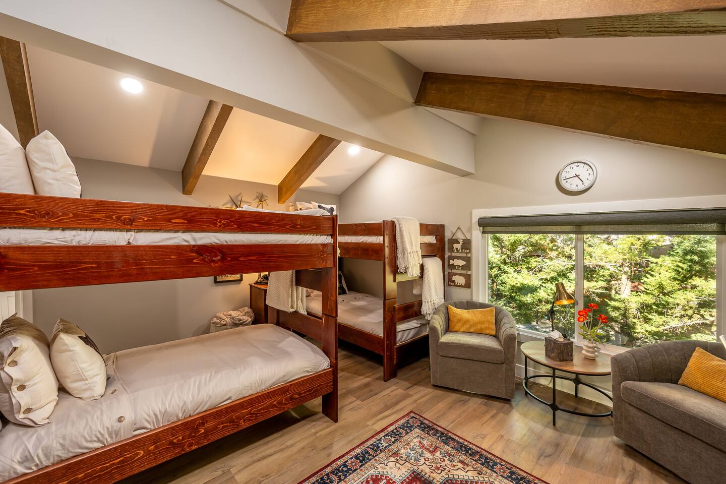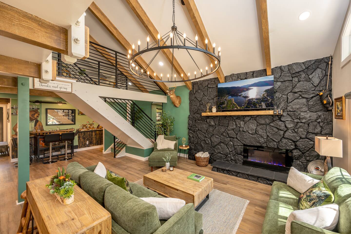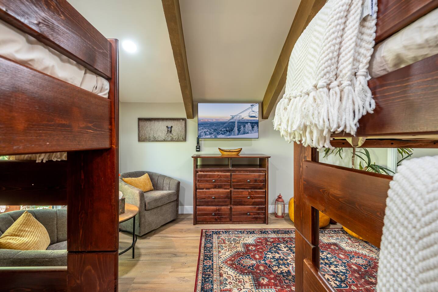 Welcome to your ultimate Big Bear getaway—just 1/4 mile from Snow Summit! This 5-bedroom, 5-bath super-cabin offers over 3,000 sq ft of rustic charm and modern comfort, perfect for large families or groups of up to 16. 📍 Nearby • Snow Summit Ski Resort: ~0.25mi • Big Bear Alpine Zoo: ~1mi • Alpine Slide at Magic Mountain: ~1mi • The Village at Big Bear Lake: ~2mi • Big Bear Discovery Center: ~3mi 🛌 Bedroom Layout: • Master Bedroom (2nd Floor): Queen bed with private bathroom ensuite • Bedroom #2 (2nd Floor): Queen bed with private bathroom ensuite • Bedroom #3 (2nd Floor): Two twin bunk beds with private bathroom ensuite • Bedroom #4 (1st Floor): Queen bed with private bathroom ensuite • Bedroom #5 (1st Floor): Queen bed with sliding door to back yard deck Step into the inviting great room with soaring vaulted ceilings, a cozy fireplace, and mountain-inspired design. The fully equipped kitchen opens to a spacious dining area, ideal for group meals or holiday feasts. Downstairs, the two-car garage has been transformed into a vibrant game room featuring a mural, foosball, board games, and more—perfect for both kids and adults to unwind after a day of adventure. Out back, relax under the stars in the private hot tub, relax around the firepit, or lounge on the large deck surrounded by pines. Four of the five bedrooms include private en-suite bathrooms for added privacy and comfort. Whether you’re hitting the slopes, hiking nearby trails, or just soaking in the alpine vibe, this centrally located home is your perfect year-round retreat in Big Bear. Come make memories that last a lifetime! AC UNIT ONLY IN GAME ROOM NOT COMPLETE HOME.