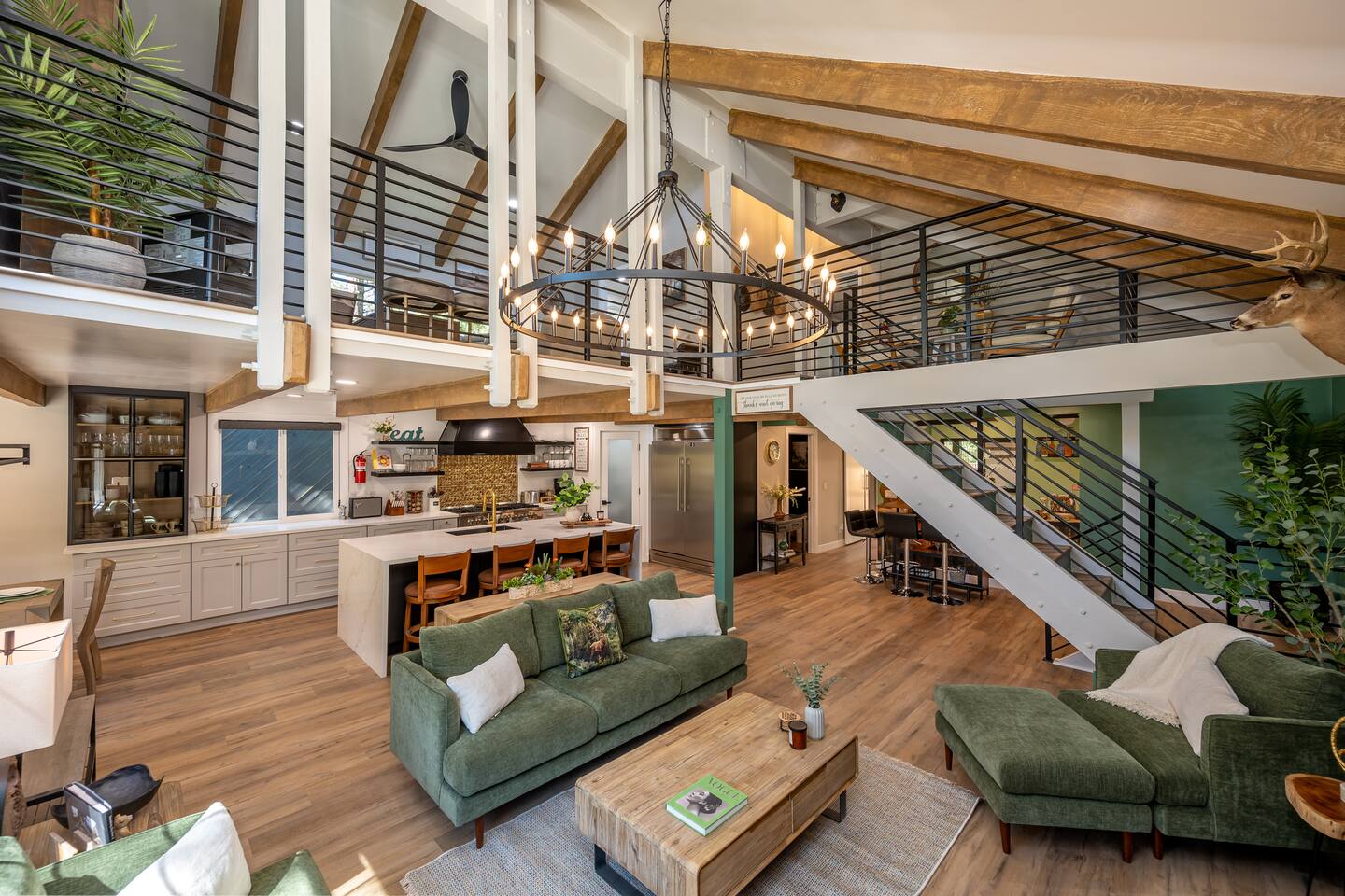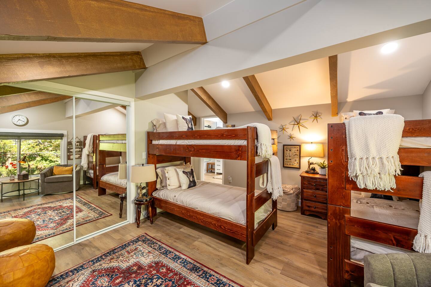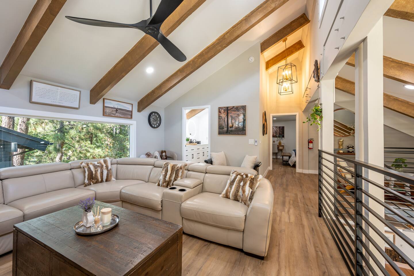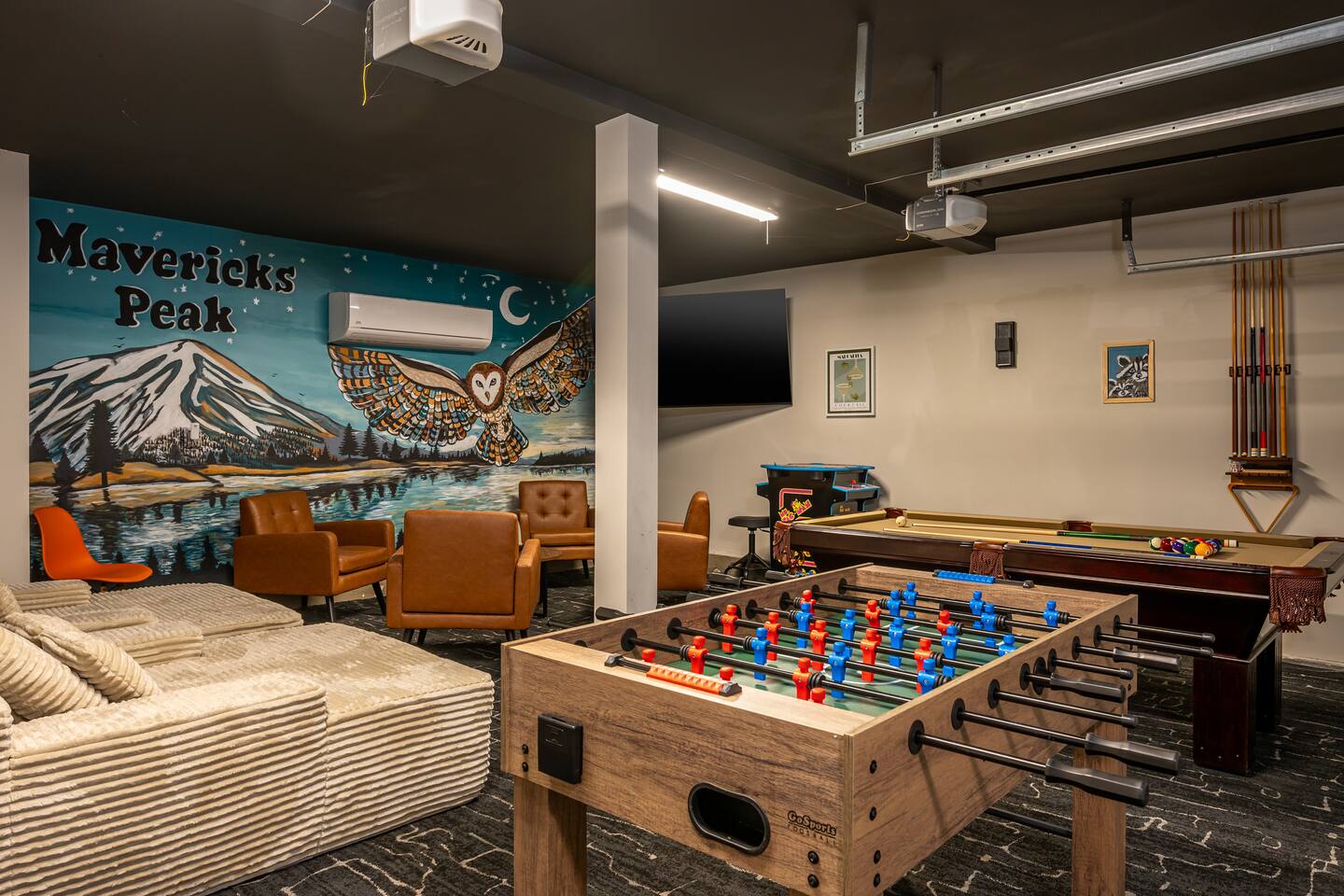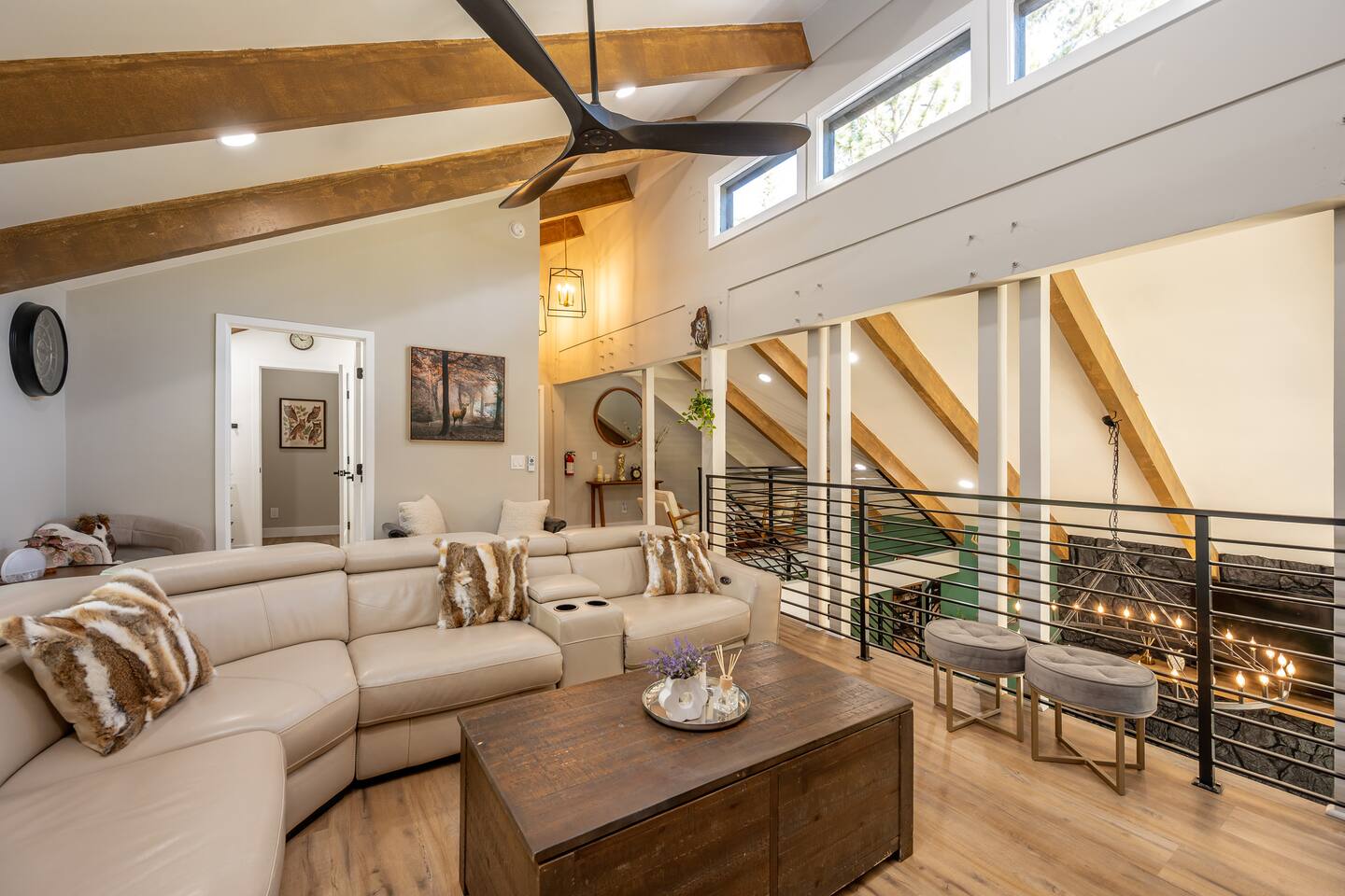 Welcome to your ultimate Big Bear getaway—just 1/4 mile from Snow Summit! This 5-bedroom, 5-bath super-cabin offers over 3,000 sq ft of rustic charm and modern comfort, perfect for large families or groups of up to 16. 📍 Nearby • Snow Summit Ski Resort: ~0.25mi • Big Bear Alpine Zoo: ~1mi • Alpine Slide at Magic Mountain: ~1mi • The Village at Big Bear Lake: ~2mi • Big Bear Discovery Center: ~3mi 🛌 Bedroom Layout: • Master Bedroom (2nd Floor): Queen bed with private bathroom ensuite • Bedroom #2 (2nd Floor): Queen bed with private bathroom ensuite • Bedroom #3 (2nd Floor): Two twin bunk beds with private bathroom ensuite • Bedroom #4 (1st Floor): Queen bed with private bathroom ensuite • Bedroom #5 (1st Floor): Queen bed with sliding door to back yard deck Step into the inviting great room with soaring vaulted ceilings, a cozy fireplace, and mountain-inspired design. The fully equipped kitchen opens to a spacious dining area, ideal for group meals or holiday feasts. Downstairs, the two-car garage has been transformed into a vibrant game room featuring a mural, foosball, board games, and more—perfect for both kids and adults to unwind after a day of adventure. Out back, relax under the stars in the private hot tub, relax around the firepit, or lounge on the large deck surrounded by pines. Four of the five bedrooms include private en-suite bathrooms for added privacy and comfort. Whether you’re hitting the slopes, hiking nearby trails, or just soaking in the alpine vibe, this centrally located home is your perfect year-round retreat in Big Bear. Come make memories that last a lifetime! AC UNIT ONLY IN GAME ROOM NOT COMPLETE HOME.