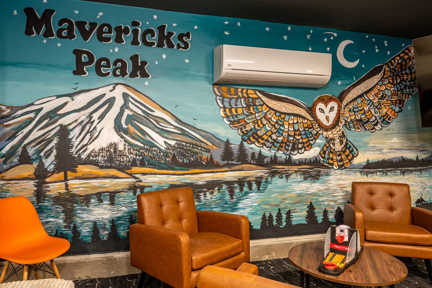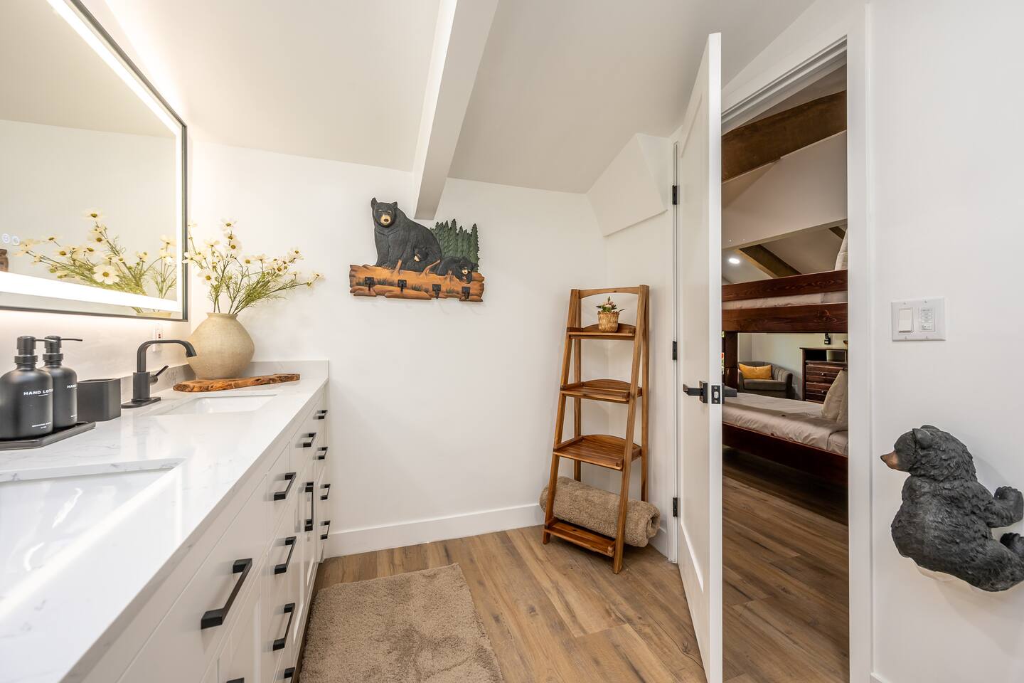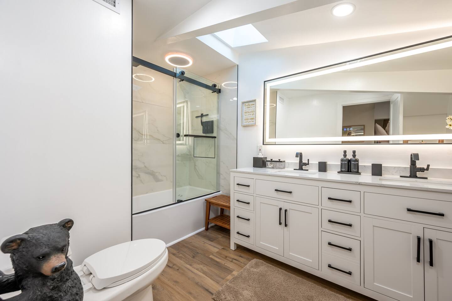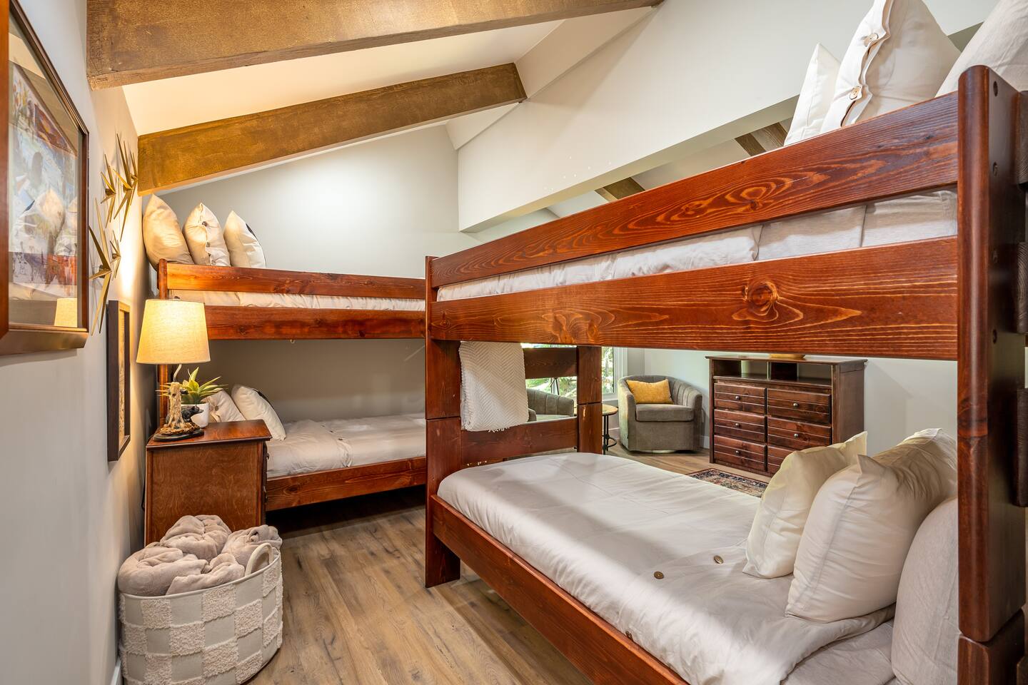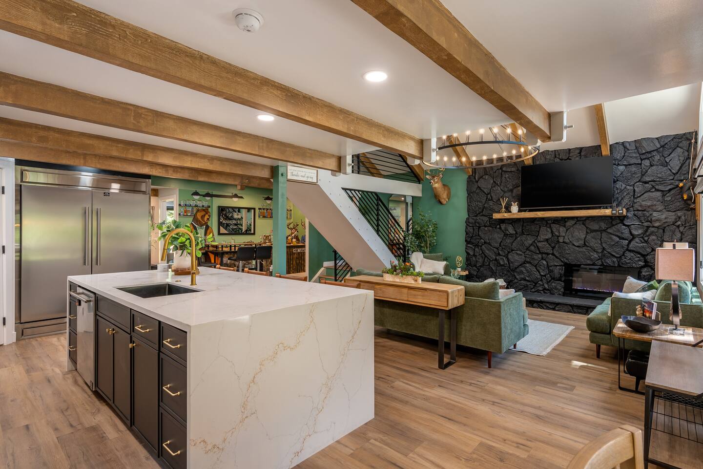 Welcome to your ultimate Big Bear getaway—just 1/4 mile from Snow Summit! This 5-bedroom, 5-bath super-cabin offers over 3,000 sq ft of rustic charm and modern comfort, perfect for large families or groups of up to 16. 📍 Nearby • Snow Summit Ski Resort: ~0.25mi • Big Bear Alpine Zoo: ~1mi • Alpine Slide at Magic Mountain: ~1mi • The Village at Big Bear Lake: ~2mi • Big Bear Discovery Center: ~3mi 🛌 Bedroom Layout: • Master Bedroom (2nd Floor): Queen bed with private bathroom ensuite • Bedroom #2 (2nd Floor): Queen bed with private bathroom ensuite • Bedroom #3 (2nd Floor): Two twin bunk beds with private bathroom ensuite • Bedroom #4 (1st Floor): Queen bed with private bathroom ensuite • Bedroom #5 (1st Floor): Queen bed with sliding door to back yard deck Step into the inviting great room with soaring vaulted ceilings, a cozy fireplace, and mountain-inspired design. The fully equipped kitchen opens to a spacious dining area, ideal for group meals or holiday feasts. Downstairs, the two-car garage has been transformed into a vibrant game room featuring a mural, foosball, board games, and more—perfect for both kids and adults to unwind after a day of adventure. Out back, relax under the stars in the private hot tub, relax around the firepit, or lounge on the large deck surrounded by pines. Four of the five bedrooms include private en-suite bathrooms for added privacy and comfort. Whether you’re hitting the slopes, hiking nearby trails, or just soaking in the alpine vibe, this centrally located home is your perfect year-round retreat in Big Bear. Come make memories that last a lifetime! AC UNIT ONLY IN GAME ROOM NOT COMPLETE HOME.