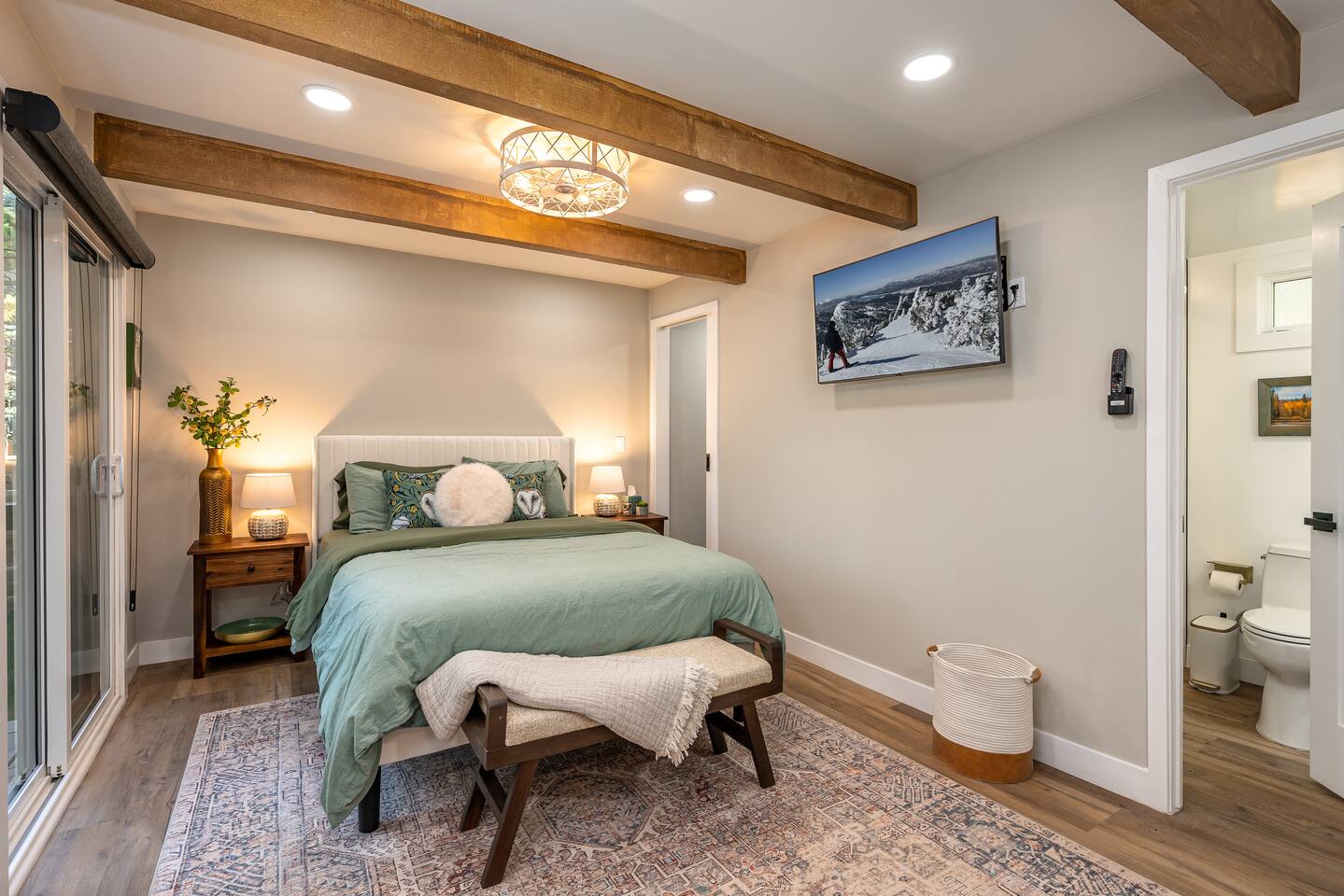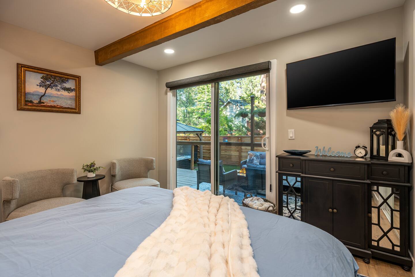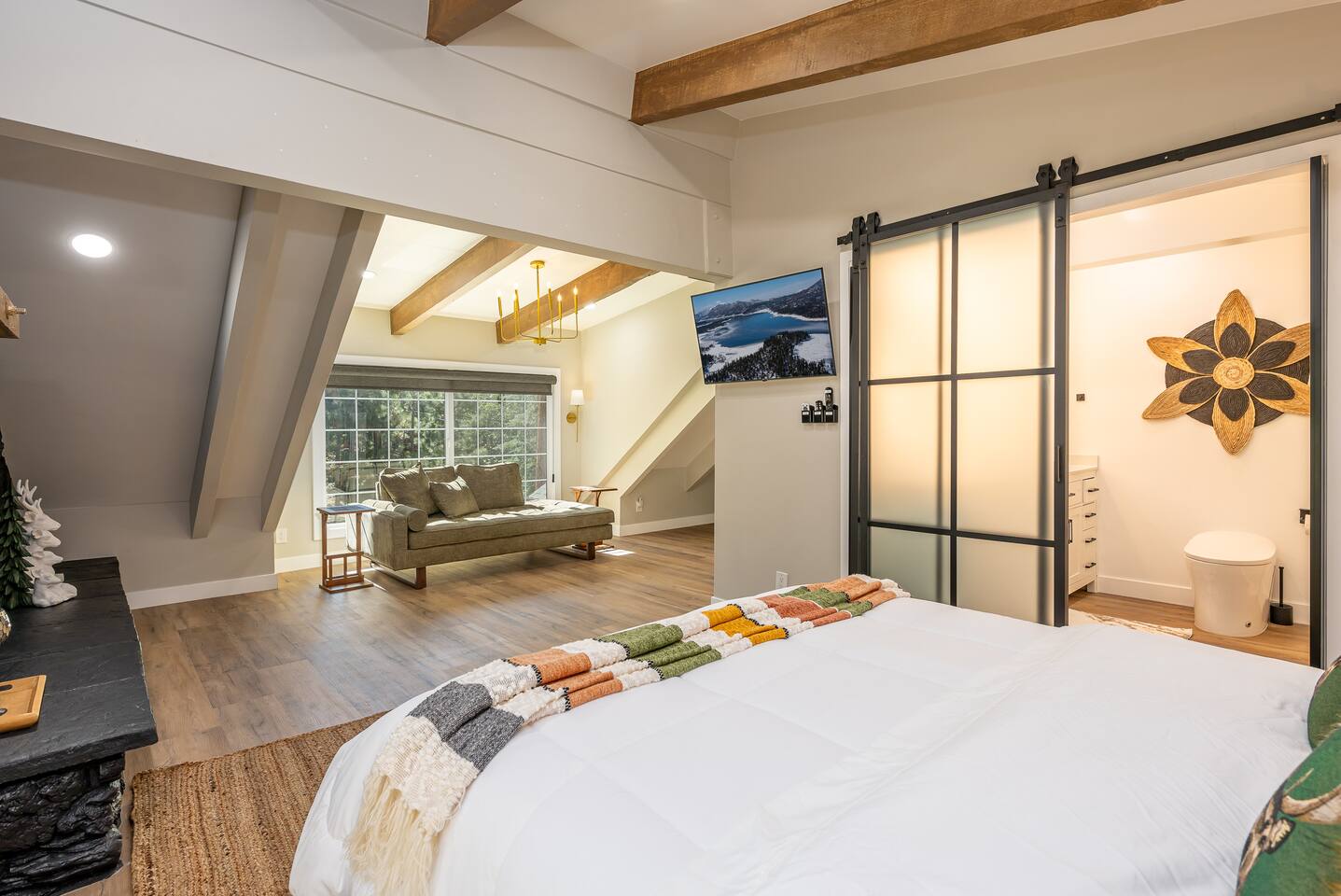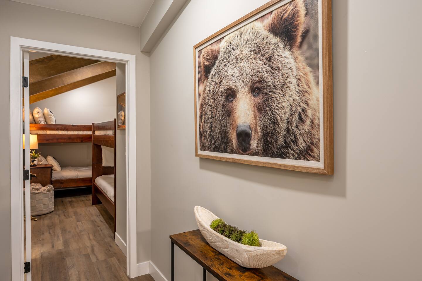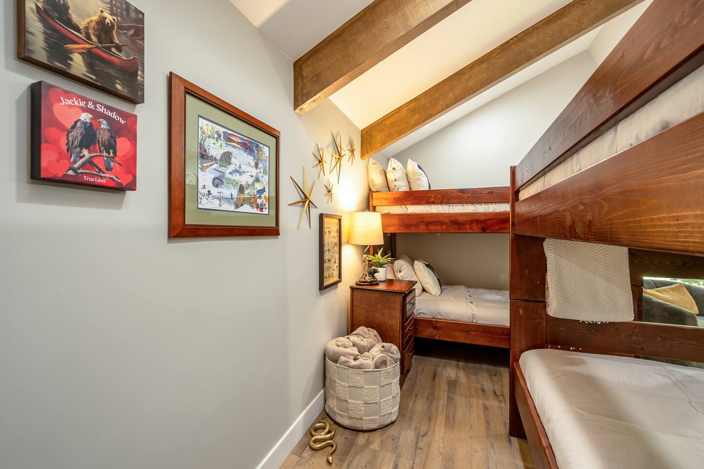 Welcome to your ultimate Big Bear getaway—just 1/4 mile from Snow Summit! This 5-bedroom, 5-bath super-cabin offers over 3,000 sq ft of rustic charm and modern comfort, perfect for large families or groups of up to 16. 📍 Nearby • Snow Summit Ski Resort: ~0.25mi • Big Bear Alpine Zoo: ~1mi • Alpine Slide at Magic Mountain: ~1mi • The Village at Big Bear Lake: ~2mi • Big Bear Discovery Center: ~3mi 🛌 Bedroom Layout: • Master Bedroom (2nd Floor): Queen bed with private bathroom ensuite • Bedroom #2 (2nd Floor): Queen bed with private bathroom ensuite • Bedroom #3 (2nd Floor): Two twin bunk beds with private bathroom ensuite • Bedroom #4 (1st Floor): Queen bed with private bathroom ensuite • Bedroom #5 (1st Floor): Queen bed with sliding door to back yard deck Step into the inviting great room with soaring vaulted ceilings, a cozy fireplace, and mountain-inspired design. The fully equipped kitchen opens to a spacious dining area, ideal for group meals or holiday feasts. Downstairs, the two-car garage has been transformed into a vibrant game room featuring a mural, foosball, board games, and more—perfect for both kids and adults to unwind after a day of adventure. Out back, relax under the stars in the private hot tub, relax around the firepit, or lounge on the large deck surrounded by pines. Four of the five bedrooms include private en-suite bathrooms for added privacy and comfort. Whether you’re hitting the slopes, hiking nearby trails, or just soaking in the alpine vibe, this centrally located home is your perfect year-round retreat in Big Bear. Come make memories that last a lifetime! AC UNIT ONLY IN GAME ROOM NOT COMPLETE HOME.