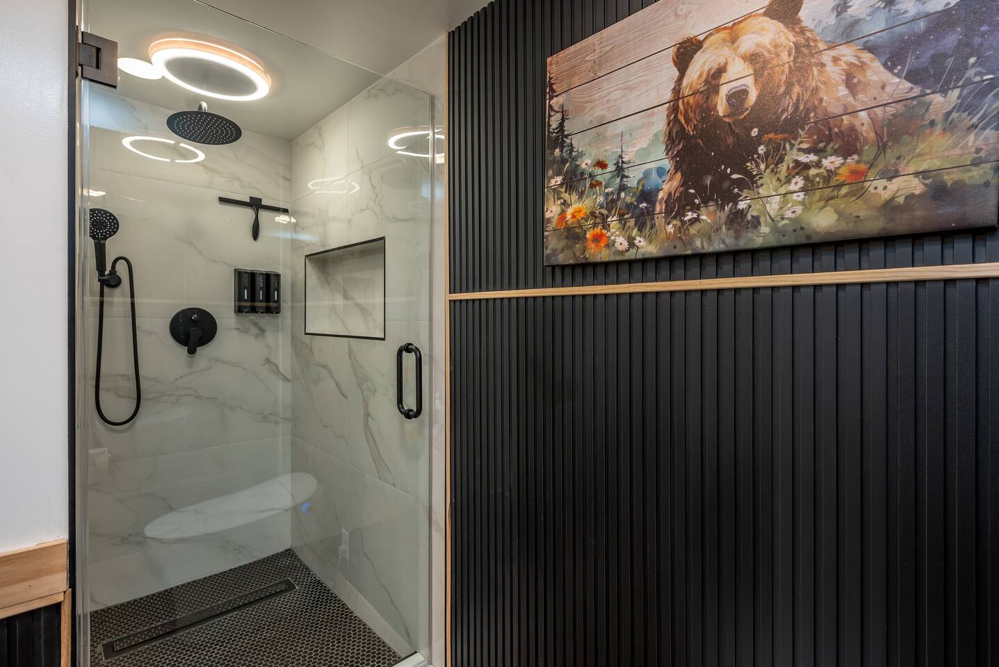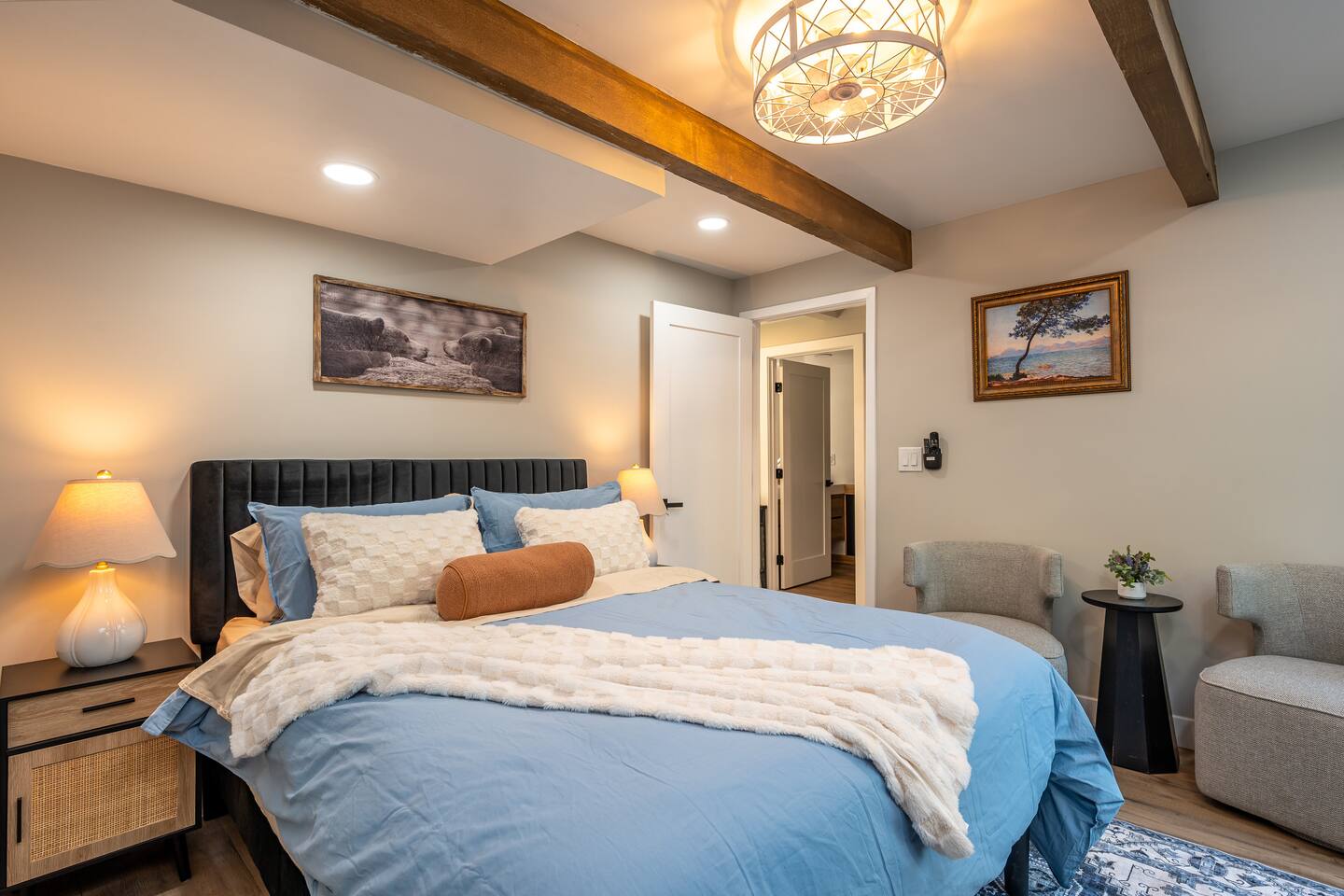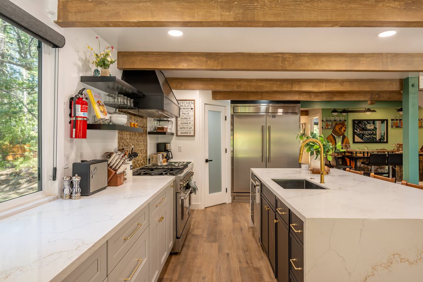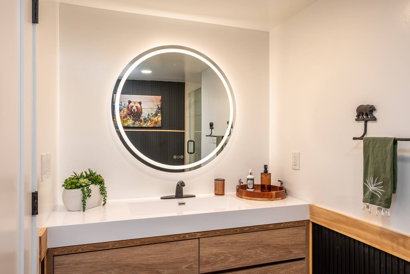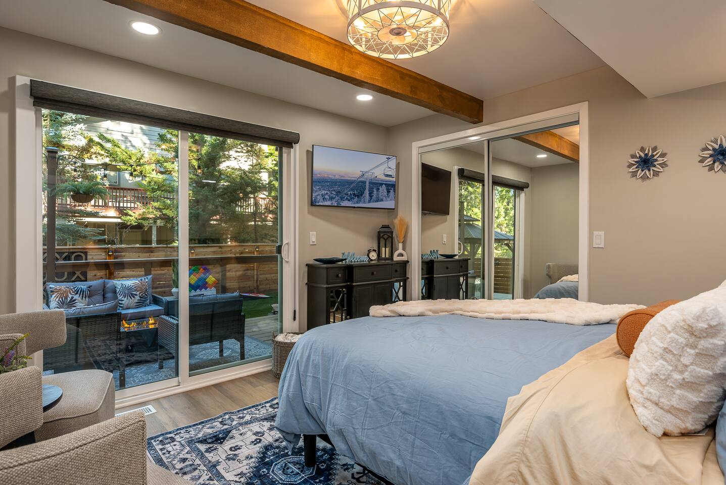 Welcome to your ultimate Big Bear getaway—just 1/4 mile from Snow Summit! This 5-bedroom, 5-bath super-cabin offers over 3,000 sq ft of rustic charm and modern comfort, perfect for large families or groups of up to 16. 📍 Nearby • Snow Summit Ski Resort: ~0.25mi • Big Bear Alpine Zoo: ~1mi • Alpine Slide at Magic Mountain: ~1mi • The Village at Big Bear Lake: ~2mi • Big Bear Discovery Center: ~3mi 🛌 Bedroom Layout: • Master Bedroom (2nd Floor): Queen bed with private bathroom ensuite • Bedroom #2 (2nd Floor): Queen bed with private bathroom ensuite • Bedroom #3 (2nd Floor): Two twin bunk beds with private bathroom ensuite • Bedroom #4 (1st Floor): Queen bed with private bathroom ensuite • Bedroom #5 (1st Floor): Queen bed with sliding door to back yard deck Step into the inviting great room with soaring vaulted ceilings, a cozy fireplace, and mountain-inspired design. The fully equipped kitchen opens to a spacious dining area, ideal for group meals or holiday feasts. Downstairs, the two-car garage has been transformed into a vibrant game room featuring a mural, foosball, board games, and more—perfect for both kids and adults to unwind after a day of adventure. Out back, relax under the stars in the private hot tub, relax around the firepit, or lounge on the large deck surrounded by pines. Four of the five bedrooms include private en-suite bathrooms for added privacy and comfort. Whether you’re hitting the slopes, hiking nearby trails, or just soaking in the alpine vibe, this centrally located home is your perfect year-round retreat in Big Bear. Come make memories that last a lifetime! AC UNIT ONLY IN GAME ROOM NOT COMPLETE HOME.